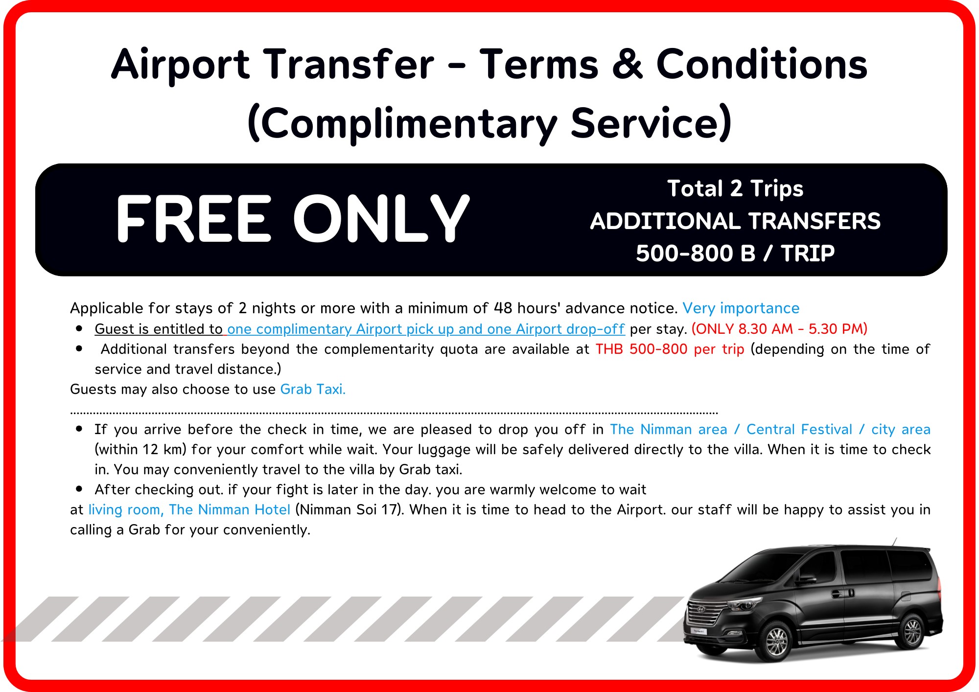 - เข้าพักตั้งแต่ 2 คืน ขึ้นไป ฟรี บริการ รับ-ส่ง สนามบิน ในเวลาทำการ 08.00-17.00 น. นอกเวลาทำการมีค่าบริการ 800บาท/รอบ
